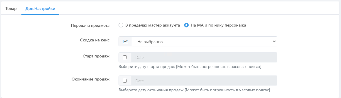 В разделе дополнительных настроек можно задать скидки и даты доступности кейса.