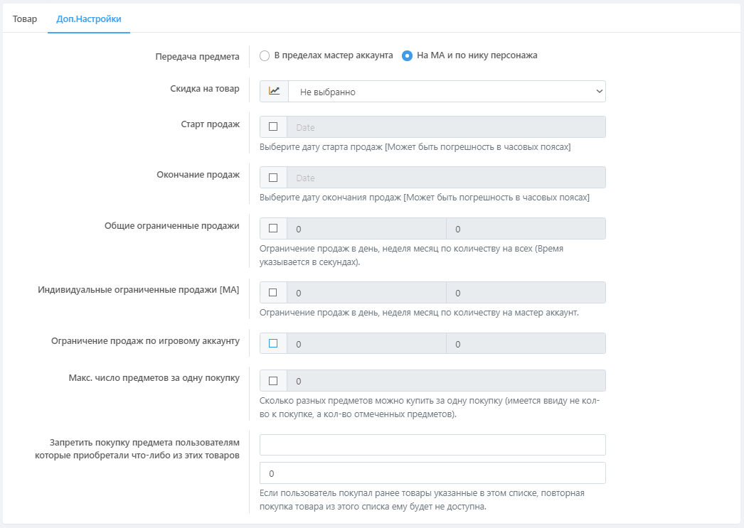 Нажав на создание нового товара или редактирование уже существующего, будет открыто окно с полным перечнем настроек товара и выдачей предметов.